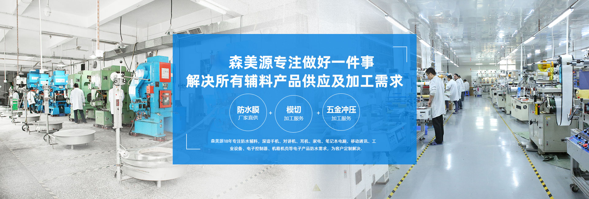 森美源位于深圳寶安大浪路鴻源工業(yè)園,占地面積5400平米,工廠擁有日本,臺(tái)灣進(jìn)口和國(guó)產(chǎn)模切機(jī)25臺(tái)及4條成熟模切組合QDC線。工廠主要用于研發(fā)生產(chǎn):電子通訊防水膜,保護(hù)膜(喇叭防水膜,咪頭防水膜聽(tīng)筒防水膜,手機(jī)防水膜各防水雙面膠)以及電子通訊的防塵防震產(chǎn)品。